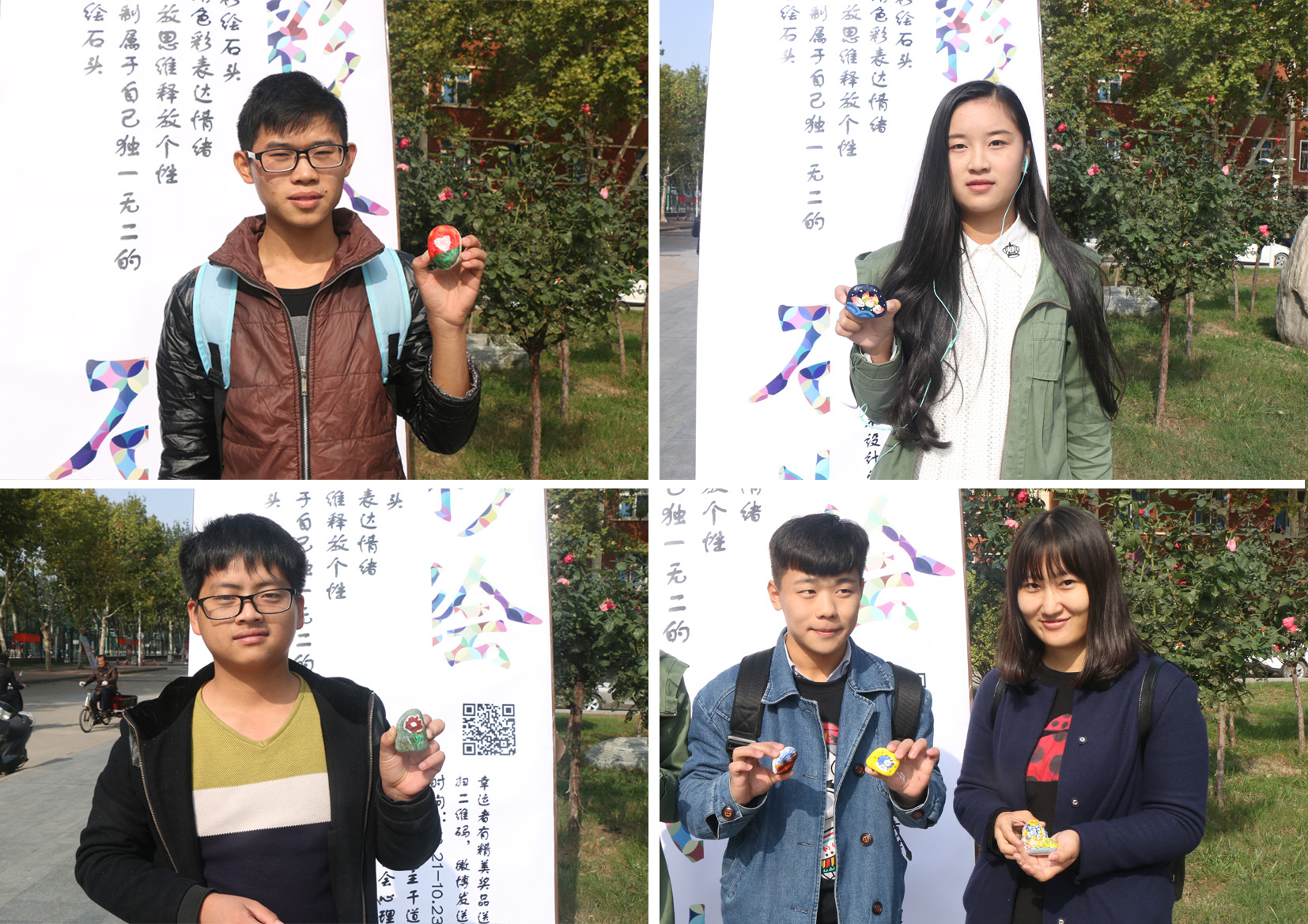 活动现场,艺术设计学院心理部为参与的同学提供了石头、画笔、颜料等工具,同学们充分利用主办方所提供的工具,充分发挥自己的才能即兴彩绘,现场动手创作属于自己心情的作品。一个个小小的石头在同学们的神笔下描绘成不同风格的图案,有中国韵味的胖娃娃,有校园风光,形式多样,色彩亮丽。画由心生,情由心生,两者交相辉映。整个活动过程中各个院系参与的学生都表现了很高的积极性,同学们活力四射、创意爆棚。本次活动以其新颖的形式,吸引了大批师生的关注与参与,校园里也掀起了一阵石头谈论风。