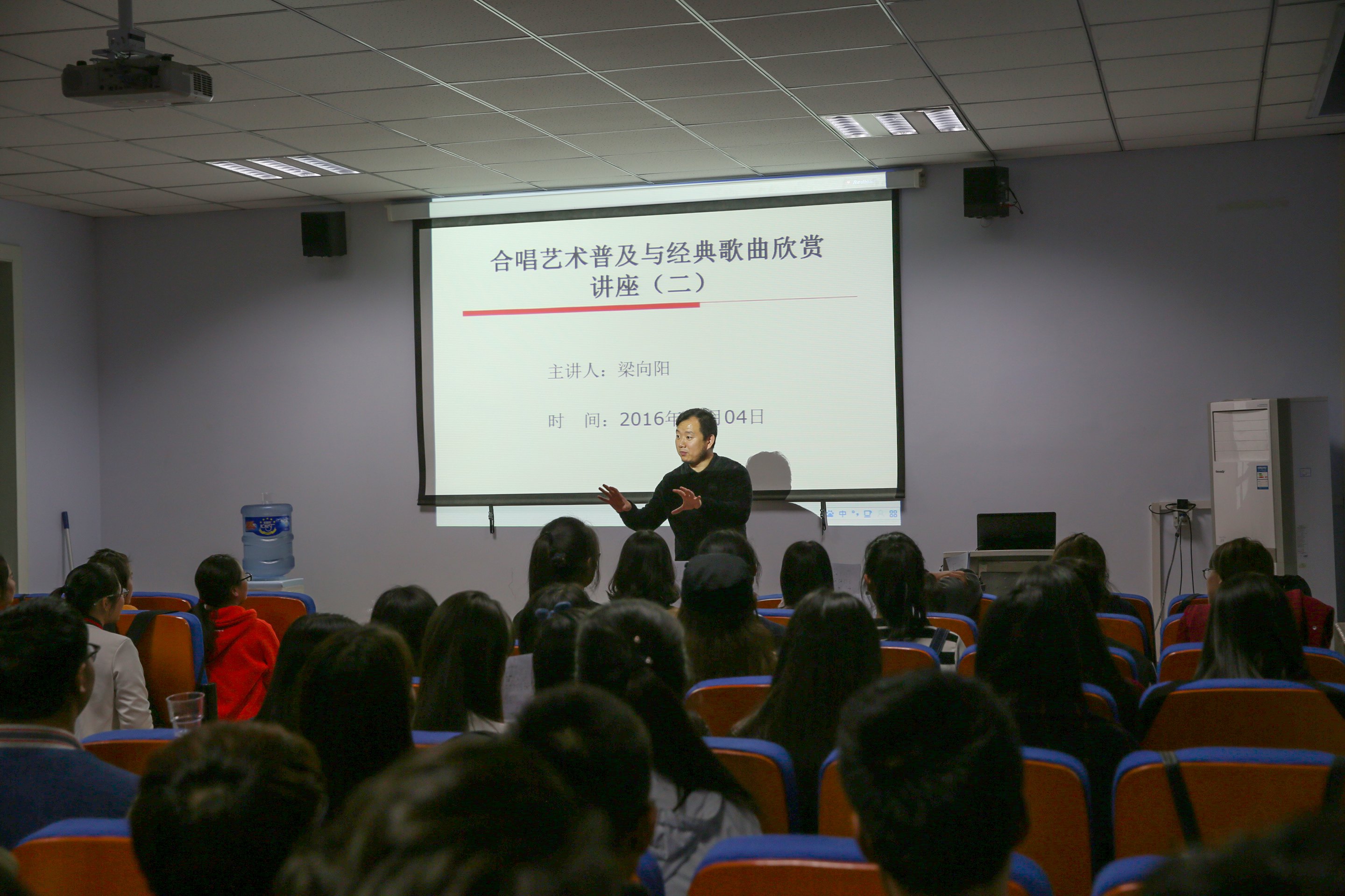 为纪念一二九学生爱国运动81周年暨纪念长征胜利80周年,丰富校园文化生活,提高大学生的人文知识和艺术修养,2016年11月3日和4日晚,艺术设计学院在东四楼301连续举办了两场“合唱艺术普及与经典歌曲欣赏”讲座,讲座邀请郑州师范学院梁向阳老师主讲,艺术设计学院各班级文艺委员及合唱爱好者近300人聆听了讲座。