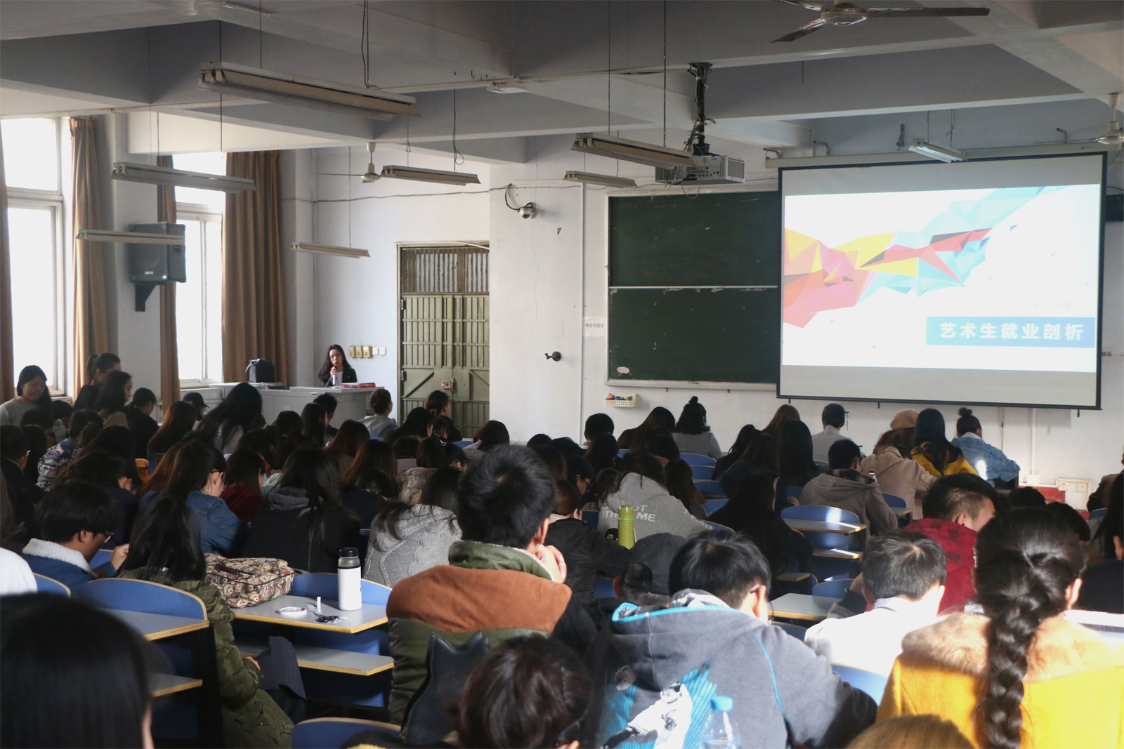 2016年11月10日下午,艺术设计学院在西五楼210教室举办了2016-2017学年大学生就业创业大讲堂之——艺术生就业剖析讲座。本次讲座特别邀请了新东方教育集团的宋慧博老师主讲。讲座由孙丰老师主持,学院2014级和2015级本科200余名同学到场聆听。