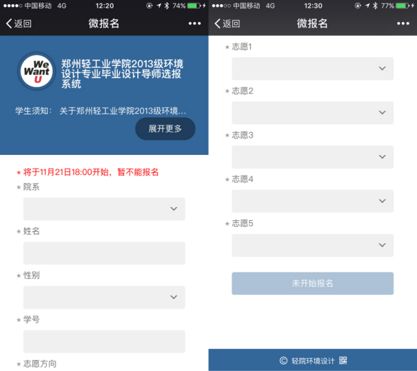 为了有效开展毕业设计,我系今年开发了以微信平台为基础上的毕业设计导师选报系统,学生们可以通过手机登录微信号在我系微信平台上填报导师志愿。该系统是我系教学改革的重要试点项目之一,拟采用数据化的手段取代过去十年来人工填报数据的方式。通过毕业设计导师选报系统,实现了“学生——教研室”的直接数据对接,取代了过去的“学生——班长——教研室”的数据上报方式,减少了数据传递时间,也减轻了相关人员的数据核对时间,有效地提高了工作效率。同时通过微信平台进行电子化的数据接收,可以极大的减少各班级班长在数据汇总时的数据误差;在毕业设计导师选报系统关闭后,教学秘书可以直接通过系统后台提取数据,完成学生志愿的筛选和录取工作。目前,环境设计系2017届毕业设计工作正在稳步进行中。我系下一步将以此为契机,继续尝试教学改革的新型技术化手段运用。