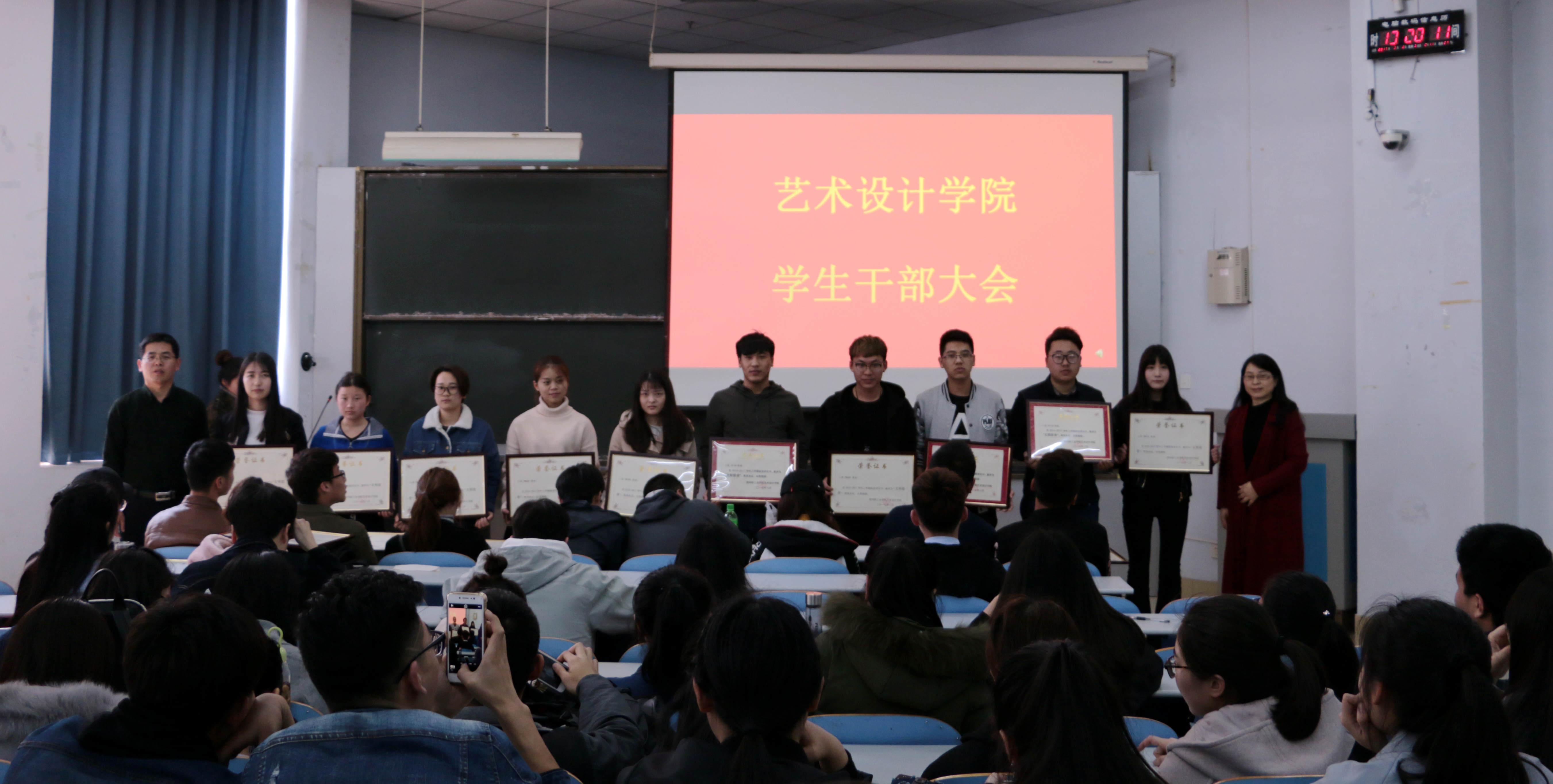 会议首先对上学期获得“文明教室”、“文明宿舍”称号的集体和在寒假社会实践活动表现突出的“先进个人”进行了表彰;接着,学工办副主任孙丰老师解读了教育部第41号令《普通高等学校学生管理规定》,并按照学校部署,结合学院实际,就艺术设计学院“安全教育月”实施方案和创新创业工作做了介绍和说明;分团委闫明老师结合学校文明单位创建、志愿服务活动、提高学生修养等就学院“文明礼仪校园行”活动方案做了安排;分团委书记任红印老师介绍了本学期学院团学工作要点,要求团学干部围绕工作要点提前谋划,组织实施,确保各项工作顺利进行。