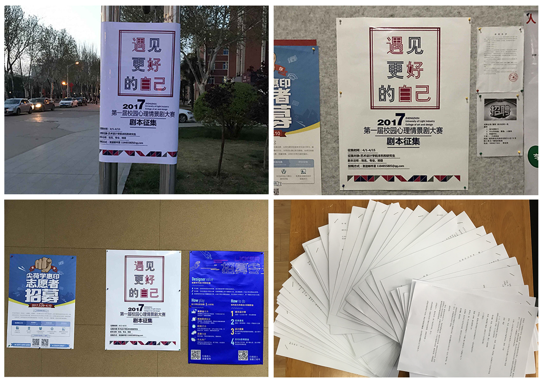 为了响应学校第七届校园心理情景剧大赛的号召,进一步加强大学生心理健康工作,切实提高大学生的心理素质,2017年4月,艺术设计学院开展了以“遇见更好的自己”为主题的校园心理情景剧剧本征集活动。