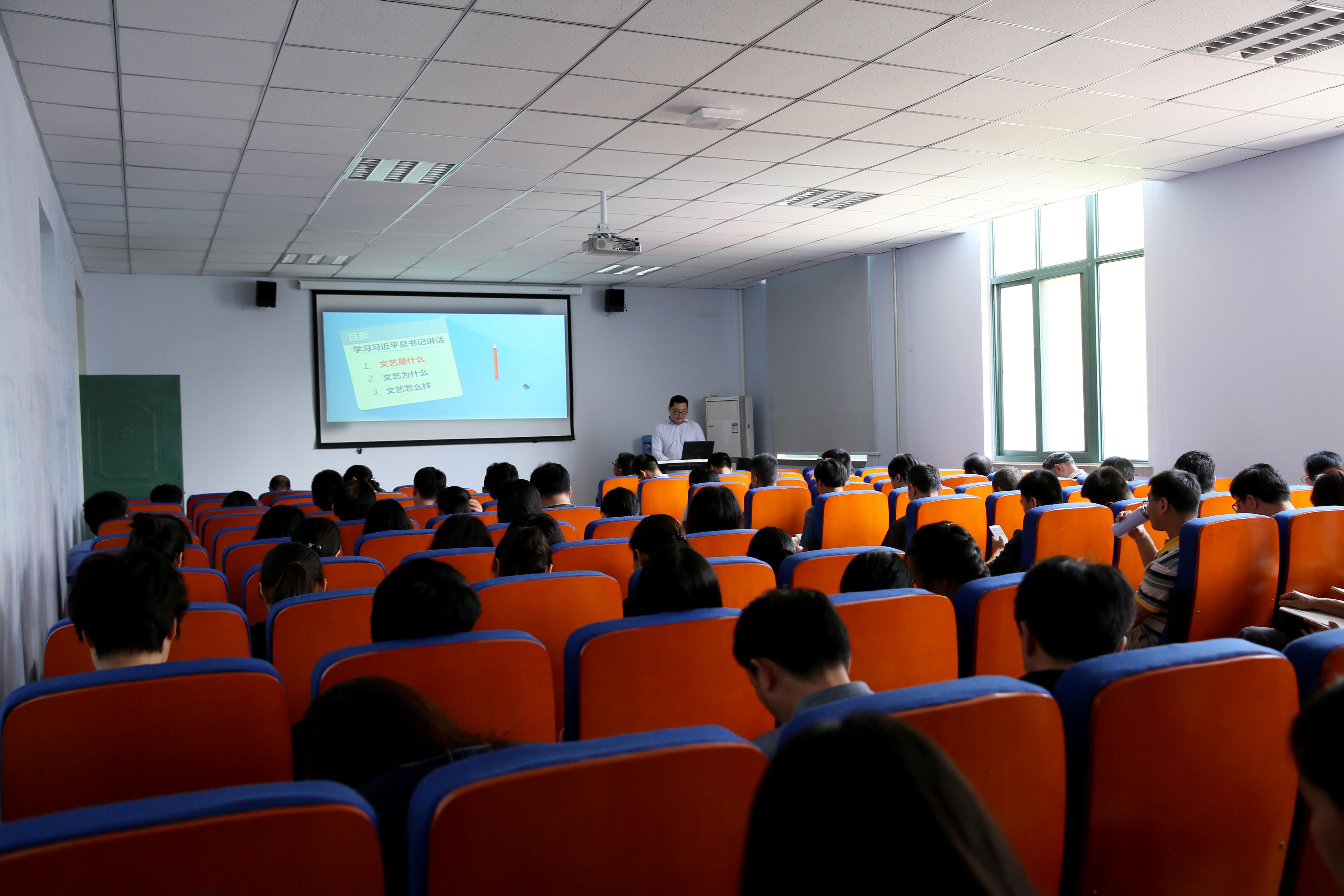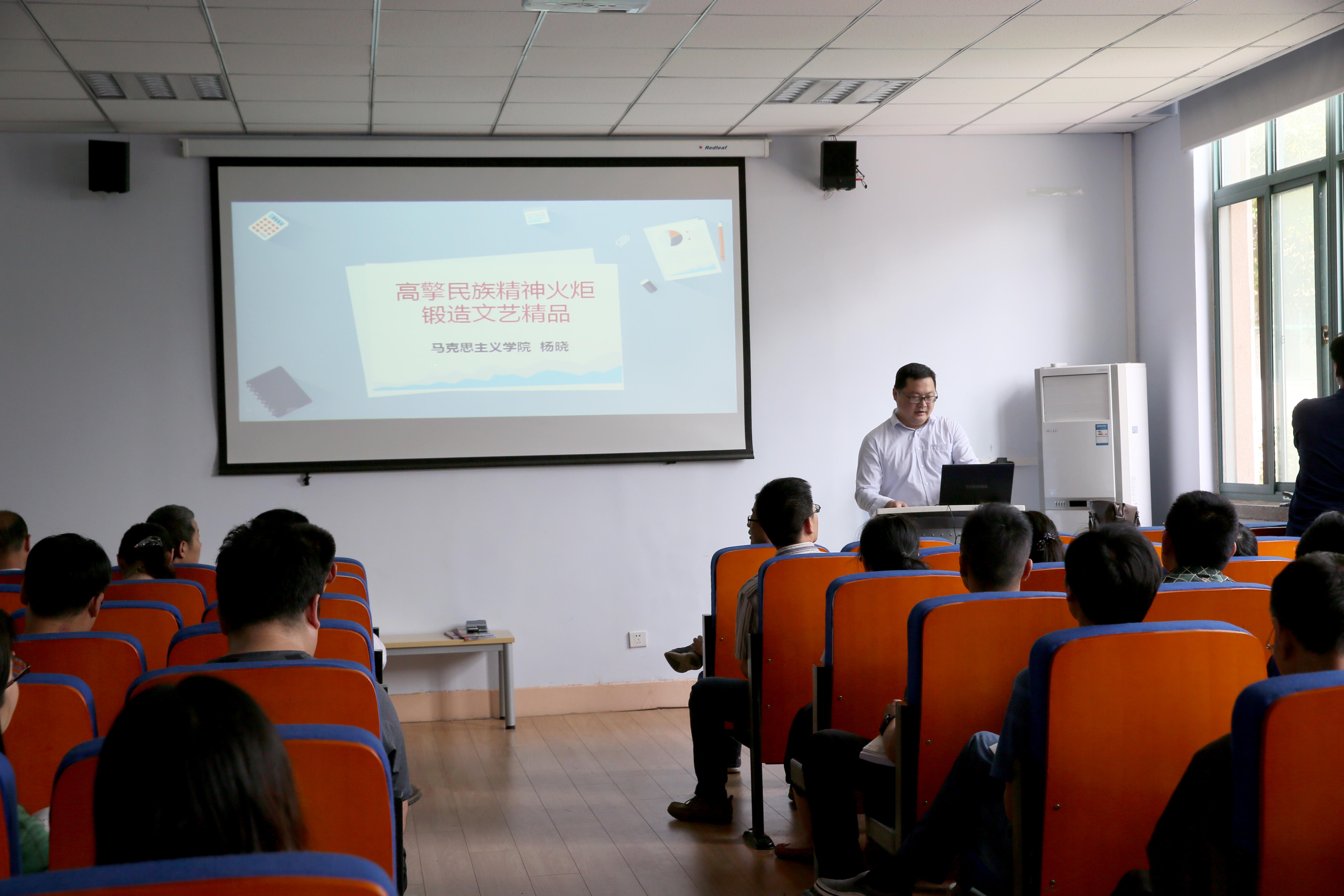 为深入学习宣传《习近平总书记在文艺工作座谈会上的讲话》等文件精神,提高教师的政治理论素质和文化素养,6月8日,艺术设计学院邀请马克思主义学院副教授杨晓博士在东四楼301教室做了一场题为《高擎民族精神火炬锻造文艺精品》的专题讲座。讲座由邵元珠书记主持,艺术设计学院一百余名教师参与。