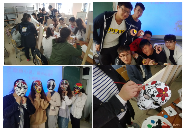 10月22日下午,艺术设计学院2017级设计学类10班在教三楼707自主开展以“绘画心灵,敞开心扉”彩绘活动。活动开始后,同学们可自由选择鸡蛋和面具这两种彩绘图案,自由发挥或参考提供的样图完成彩绘,这种方式使同学们在彩绘中认清自我,肯定自我价值,在共同绘画过程中,学会自我思考,同时舒展内心,彼此压力得到释放。最后为同学们播放励志视频《永不言弃》,鼓励同学们要自信,要坚持下去,别轻易说“不”,要以更加健康积极的心态面对生活。