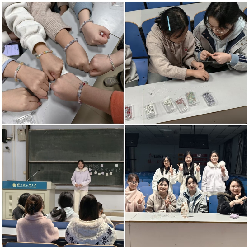 11月9日,设计学类24-07班在教三106教室举办“撕掉标签,串起温暖”主题活动。活动伊始,黑板上张贴的“死宅”“懦弱”等负面标签被同学们一一撕下,取而代之的是对自我突破的渴望与宣言。随后的串珠手链环节中,大家围坐在一起挑选珠子、交流搭配巧思,指尖的创作让温暖在班级里流淌。这一活动通过手工媒介帮助同学们更加自如地敞开心扉,在审美交流中重塑自信,获得展现自我的勇气。
